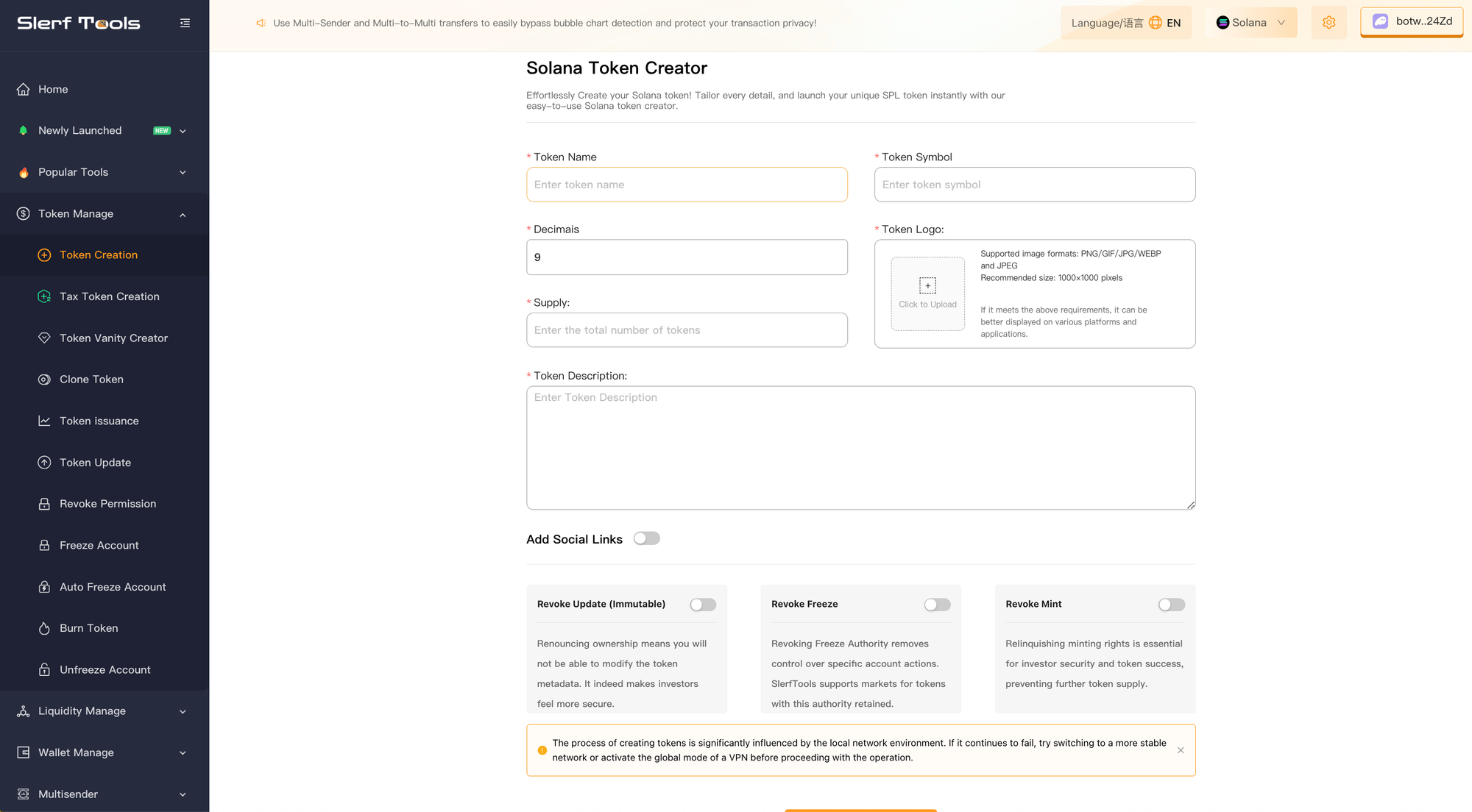 SlerfTools is the cheapest Solana token creator, enabling you to create tokens and manage permissions for just 0.1 SOL.
