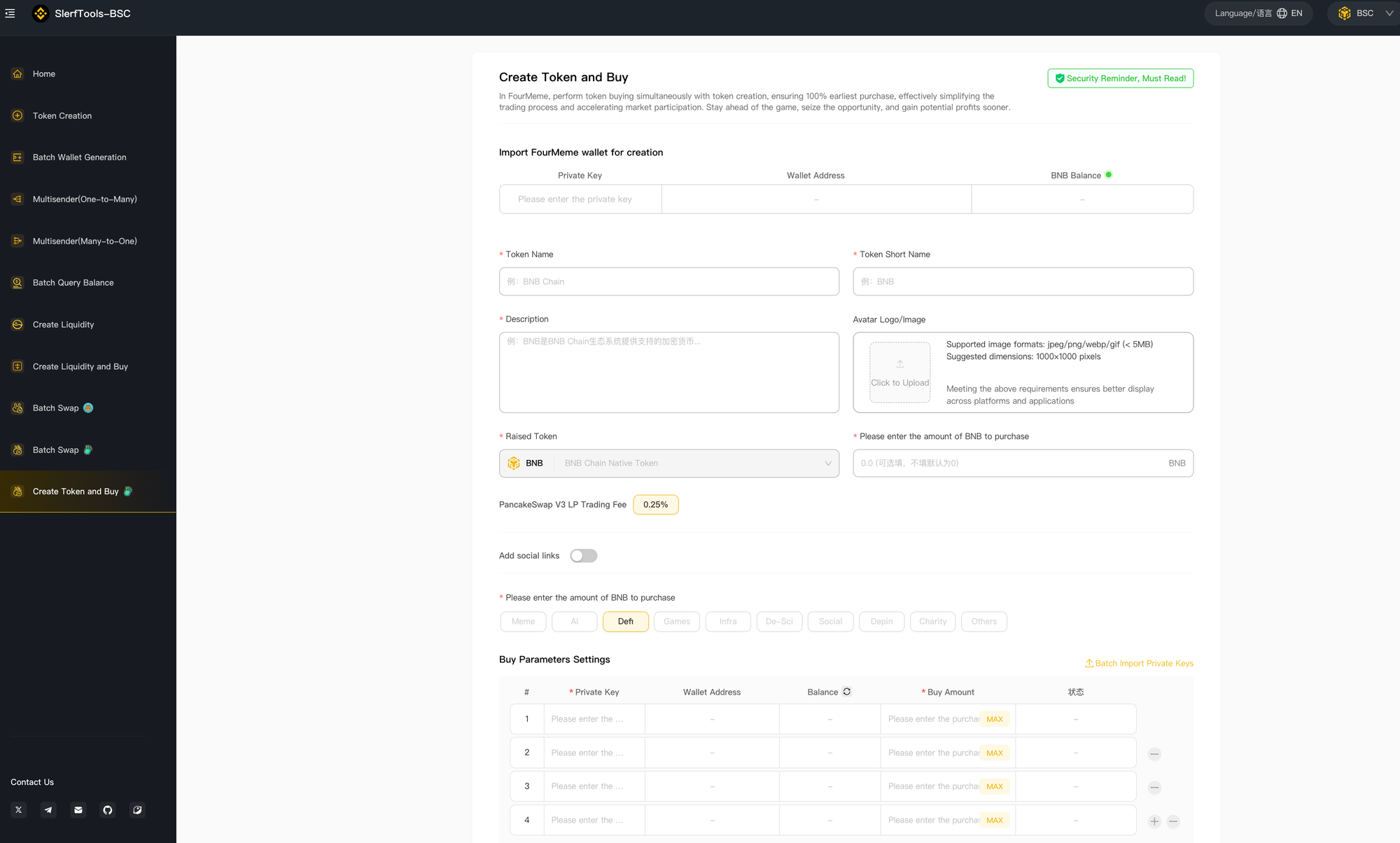 Open the tool page: https://bsc.slerf.tools/en-us/fourmeme-create-token-and-buy/bnb
