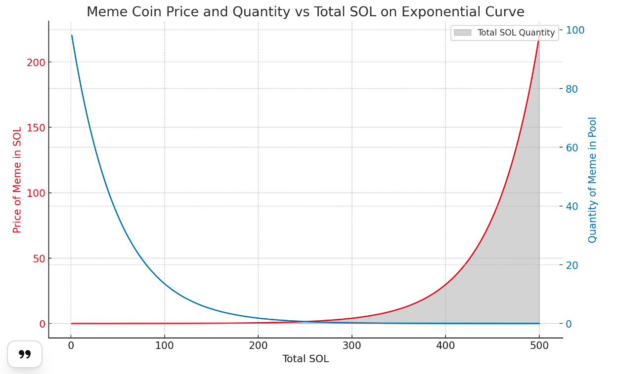 - 红色曲线:显示了 Meme 代币的价格(以 SOL 为单位)随 SOL 总量的变化。价格采用指数函数计算,显示出随着 SOL 总量的增加,价格急剧上升的趋势。