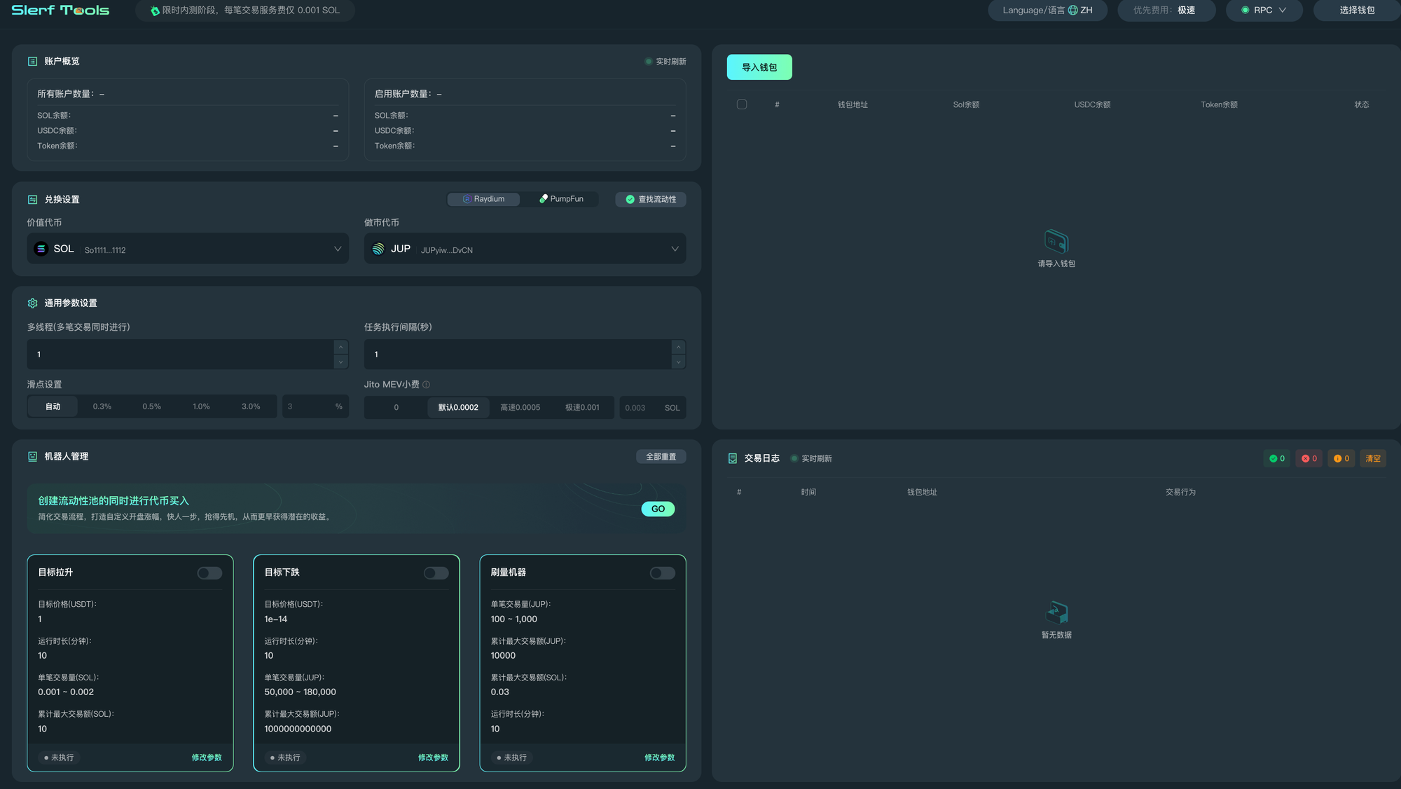 SlerfTools 的市值管理工具为 Solana 项目提供高效的刷单解决方案,支持多策略自动交易、批量操作和实时监控。无论是提升交易量、稳定价格还是优化市场表现,这款工具都能帮助项目方实现市场目标,吸引更多关注。
